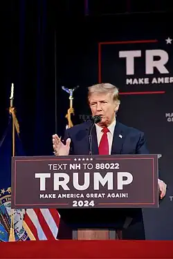 Le 30 mai 2024, Trump est condamné pour 34 crimes et délits liés à l'argent de silence versé à l'actrice pornographique Stormy Daniels dans le but d'influencer l'élection présidentielle de 2016[41]. Il est le premier ancien président des États-Unis à être reconnu coupable d'un crime dans l'histoire américaine. Après avoir remporté une victoire écrasante lors des caucuses républicains de l'Iowa en 2024, Trump est généralement décrit comme le candidat présidentiel présumé du Parti républicain[42],[43], un processus de consolidation du parti étant alors en cours[44]. Le 13 juillet 2024, Trump survit après avoir été blessé à l'oreille droite par Thomas Matthew Crooks lors d'une tentative d'assassinat lors d'un rassemblement de campagne présidentielle en 2024[45],[46].