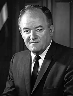 Le , Johnson stupéfia la nation en indiquant qu'il ne solliciterait pas un nouveau mandat présidentiel. Lors de cette même allocution télévisée, il annonça un arrêt partiel des bombardements au Viêt Nam et sa volonté d'ouvrir les négociations de paix avec les Nord-Vietnamiens[13]. Le vice-président Hubert Humphrey, connu pour son engagement de longue date auprès des syndicats et du mouvement des droits civiques, se déclara candidat le , avec le soutien de l'establishment du parti : élus démocrates au Congrès, maires, gouverneurs, syndicats,[14],[15] … La candidature d'Humphrey intervint trop tard pour permettre à celui-ci de participer aux primaires, même s'il figura en tant que candidat hors-liste dans divers scrutins de la campagne ; toutefois, fort de l'appui du président et de nombreux militants démocrates, il était en bonne position pour rafler les délégués des États dans lesquels aucune primaire n'avait été organisée[16],[17]. À l'inverse, Kennedy, tout comme son frère avant lui, comptait se servir des primaires pour attester d'un soutien populaire en faveur de sa candidature et accroître ses chances en vue de la nomination. Étant donné que les « poids lourds » du parti jouaient un rôle crucial dans la sélection des délégués et le déroulement des votes lors de la convention nationale démocrate, la stratégie de Kennedy consistait à remporter plusieurs victoires décisives durant les primaires afin d'impressionner les « décideurs » ; un calcul semblable avait déjà permis à son frère de s'imposer en 1960 face à Humphrey lors de la primaire de Virginie-Occidentale[3].