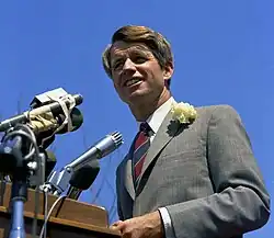 Le , Kennedy remporta la primaire de Californie avec 46 % des suffrages contre 42 % pour McCarthy[74], raflant ainsi les 174 délégués de l'État[68]. Il arriva également en tête dans le Dakota du Sud où les scores furent de 50 % pour Kennedy, 30 % pour Humphrey et 20 % pour McCarthy[74]. Il fut en revanche battu par McCarthy dans le New Jersey (38 % contre 33 %)[75]. Le résultat de cette journée fut cependant très positif pour Kennedy qui jouissait désormais du statut de favori dans la course à la nomination[76]. Aux alentours de minuit, il se rendit à l'hôtel Ambassador de Los Angeles pour y saluer ses partisans et termina son allocution par ses mots : « mes remerciements à vous tous. En route pour Chicago pour y remporter la victoire »[70].