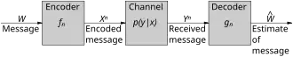 - La probabilité d'erreur . Dans le cas d'un canal discret (et en supposant que est tiré uniformément), cette probabilité s'exprime par :
