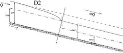 En théorie, le mouvement est variable mais il est généralement schématisé comme un mouvement continu ; il est donc possible de retracer une hauteur de mouvement uniforme et une hauteur critique dans un lit à faible pente () et dont le courant est vraisemblablement lent. On trace le profil d'aval en amont en considérant une section de vallée et, de là, en regardant la vallée, s'il ne se produit pas de perturbation, on considère que le mouvement est uniforme après la section A, on aura donc un profil D2 avant la section A. La présence du canal de dérivation génère le profil présenté sur le schéma.