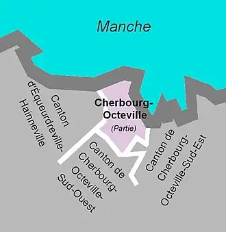 La carte de situation du canton, littoral de la Manche. Les cantons limitrophes étaient ceux de Cherbourg-Octeville-Sud-Est, de Cherbourg-Octeville-Sud-Ouest et d’Équeurdreville-Hainneville.