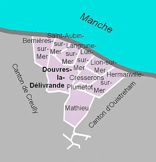 À la suite du redécoupage des cantons pour 2015, les communes de Bernières-sur-Mer, Cresserons, Douvres-la-Délivrande, Langrune-sur-Mer, Luc-sur-Mer, Plumetot et Saint-Aubin-sur-Mer sont rattachées au canton de Courseulles-sur-Mer et les communes d'Hermanville-sur-Mer, Lion-sur-Mer et Mathieu à celui d'Ouistreham.