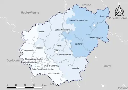 Canton d'Argentat-sur-Dordogne - Canton de Corrèze - Canton d'Égletons - Canton de Lapleau - Canton de Mercœur - Canton de La Roche-Canillac - Canton de Saint-Privat - Canton de Seilhac - Canton de Treignac - Canton de Tulle-Campagne-Nord - Canton de Tulle-Campagne-Sud - Canton de Tulle-Urbain-Nord - Canton de Tulle-Urbain-Sud - Canton d'Uzerche - arrondissement d'Ussel (8 cantons - sous-préfecture : Ussel) :