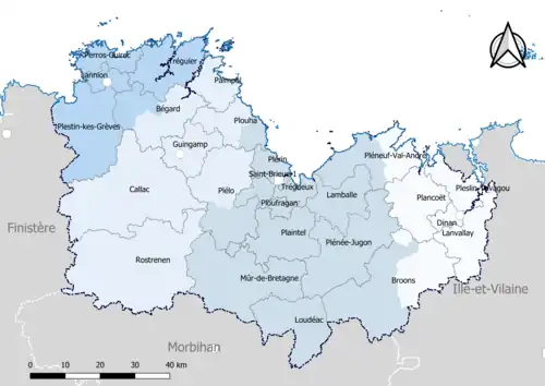 canton de Bégard - canton de Belle-Isle-en-Terre - canton de Bourbriac - canton de Callac - canton de Gouarec - canton de Guingamp - canton de Maël-Carhaix - canton de Mûr-de-Bretagne - canton de Plouagat - canton de Pontrieux - canton de Rostrenen - canton de Saint-Nicolas-du-Pélem
