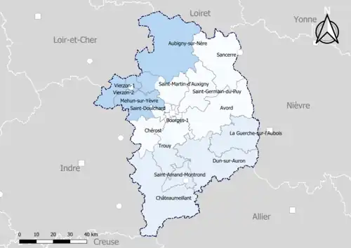 | 9 | Dun-sur-Auron | Dun-sur-Auron | 16 582 | 1,01 | 32 | Arpheuilles, Augy-sur-Aubois, Bannegon, Bessais-le-Fromental, Bussy, Chalivoy-Milon, Charenton-du-Cher, Chaumont, Cogny, Contres, Coust, Dun-sur-Auron, Givardon, Grossouvre, Lantan, Mornay-sur-Allier, Neuilly-en-Dun, Neuvy-le-Barrois, Osmery, Parnay, Le Pondy, Raymond, Sagonne, Saint-Aignan-des-Noyers, Saint-Denis-de-Palin, Saint-Germain-des-Bois, Saint-Pierre-les-Étieux, Sancoins, Thaumiers, Vereaux, Vernais, Verneuil. |