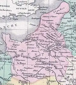En 987, le duc des Francs Hugues Capet est élu roi au détriment du prétendant carolingien Charles de Basse-Lotharingie, oncle du défunt roi Louis V, grâce au soutien actif d'Adalbéron, l'archevêque de Reims. Son règne est marqué par la faiblesse du pouvoir royal face aux grands seigneurs. Hugues n'intervient jamais au sud du royaume. Son autorité est limitée au domaine royal, qui est alors un territoire de taille modeste, et à ses vassaux sur lesquels il exerce un pouvoir direct. Sur le plan militaire la nouvelle dynastie doit asseoir sa prééminence contestée par certains vassaux. Son petit-fils Henri Ier (1008-1060) et son arrière petit-fils Philippe Ier (1052-1108) dans leurs luttes pour étendre le domaine royal subiront des revers militaires.