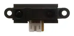 Il y a différentes versions de ces télémètres, qui possèdent différentes plages de mesure, qui peuvent envoyer la mesure par une tension analogique ou par émission de 8bits série, ou bien qui signalent si un objet se trouve en dessous d'une distance donnée. On choisit un modèle, capable de mesurer une distance entre 4 et 30 cm, et qui la délivre par une sortie analogique et on obtient cette courbe qui montre la relation distance ↔tension de sortie. À cause de cette relation trigonométrique entre distance et angle, la sortie du capteur est non bijective, il faut donc se méfier tout particulièrement des objets à moins de 4 cm qui renvoient une information de distance pouvant être interprétée comme étant issue d'un objet beaucoup plus lointain.