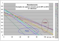 Les valeurs typiques en 2011-2012 pour les capteurs vitrés et à tubes[26] du laboratoire suisse SPF (Solartechnik Prüfung Forshung) sont les suivantes (pour les surfaces d’absorbeur) :