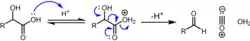 - La carbonylation d'alcènes, d'alcools ou d'aldéhydes en présence comme catalyseur d'un acide fort ou d'un superacide — tels que l'acide sulfurique H2SO4, le mélange d'acide phosphorique H3PO4 et de trifluorure de bore BF3, ou encore le mélange acide fluorhydrique HF et pentafluorure d'antimoine SbF5 donnant de l'acide fluoroantimonique HSbF6 — est connue sous le nom de synthèse de Koch ou encore réaction de Koch-Haaf. Les principaux produits sont des acides carboxyliques.