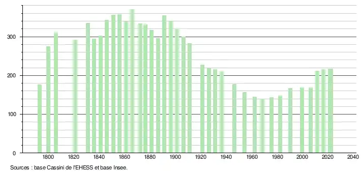 L'évolution du nombre d'habitants est connue à travers les recensements de la population effectués dans la commune depuis 1793. Pour les communes de moins de 10 000 habitants, une enquête de recensement portant sur toute la population est réalisée tous les cinq ans, les populations de référence des années intermédiaires étant quant à elles estimées par interpolation ou extrapolation[39]. Pour la commune, le premier recensement exhaustif entrant dans le cadre du nouveau dispositif a été réalisé en 2006[40].