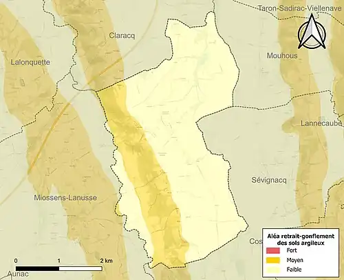 Le retrait-gonflement des sols argileux est susceptible d'engendrer des dommages importants aux bâtiments en cas d’alternance de périodes de sécheresse et de pluie[26]. 26,2 % de la superficie communale est en aléa moyen ou fort (59 % au niveau départemental et 48,5 % au niveau national)[Carte 3]. Depuis le , en application de la loi ELAN, différentes contraintes s'imposent aux vendeurs, maîtres d'ouvrages ou constructeurs de biens situés dans une zone classée en aléa moyen ou fort[Note 4],[27].