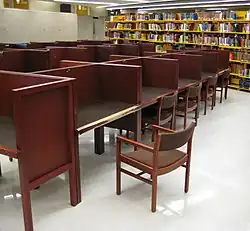 Dans les bibliothèques anglo-saxonnes, on appelle carrel d'étude un meuble de bureau cloisonné sur le devant et les côtés, permettant ainsi au lecteur d'être isolé de ses voisins.
