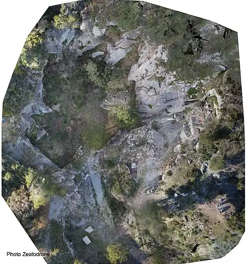 L'accès s'effectue par un chemin d’exploitation creusé à même la roche offrant un magnifique point de vue sur la plaine de l’Aude, les Corbières et les Pyrénées. Il débouche sur une plateforme, ancienne carrière remblayée par les rebuts d’exploitations postérieures. En dessous de cette aire de retournement des charrois et des camions, on distingue dans le lit d’une ancienne cascade de très anciennes traces d’outils. L’esplanade se prolonge au Nord par une carrière en amphithéâtre et sur le côté Est d’un talweg qui suit le pendage des couches de marbres. La société Zealodrone a estimé en 2017 le volume de marbre extrait de cette carrière principale à environ 13 400 m3. Au dessus de cette carrière, trois autres carrières ont été récemment mises à jour.