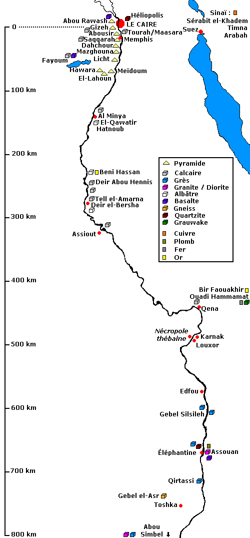 - le calcaire utilisé pour la taille de pierres est sur le plateau de Gizeh ; on en trouve également dans le Fayoum, à Al-Minya, à Amarna et à Assiout ;