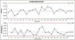 Les limites de contrôle s'obtiennent en calculant d'abord les valeurs absolues des différences entre deux données successives. Si le nombre de données est n, le nombre de résultats ainsi obtenus est donc n -1. Soit m la moyenne de ces résultats. La distance des limites de contrôle à la ligne moyenne du graphique est 2,66 x m.