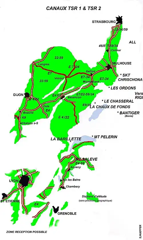 Cette ancienne carte de réception datant de l'analogique technique, indicative, donne une information visuelle sur les zones (vert) dans lesquelles il était possible de capter plus ou moins bien en France les deux chaînes de la Radio télévision suisse, RTS Un et RTS Deux (ex-TSR), avec des antennes adaptées aux fréquences émises, VHF I et III et UHF. L'échelle de la carte ne permet pas de mentionner l'existence de zones d'ombre locales hertziennes (surtout en UHF).