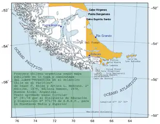 - ↑ (de) Andrea Wagner, Der argentinisch-chilenische Konflikt um den Beagle-Kanal. Ein Beitrag zu den Methoden friedlicher Streiterledigung. Verlag Peter Lang, Frankfort sur le Main, 1992, (ISBN 3-631-43590-8) p. 106 :«Resumé:Es existierten verschiedene argentinische Karten, die die Rechtauffassung Chiles widerspiegelten, v.a. in der Zeit unmittelbar nach dem Abschluß des Grenzvertrages von 1881. Das chilenische Kartenmaterial war dagegen stets einheitlich geblieben, und hat nur die chilenische Auffassung wiedergegeben.»