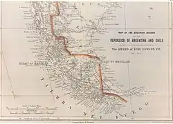 - La carte publiée en 1887 par le Bureau argentin de l'information à Londres: La note no 102 concerne cette carte. Il refusa l'argument : « une ligne de démarcation complètement fantaisiste qui pouvait avoir aucune justification possible dans le cadre du traité de 1881 ». La carte a été corrigée par le même bureau sur la carte publié l'année suivante, elle est disponible ici.