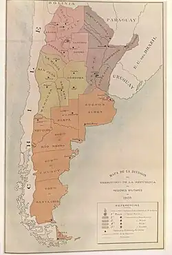 Cette reproduction de la « carte de la division du territoire argentin en régions militaires » de 1905 fut incluse dans le bulletin militaire du ministère argentin de la guerre, année IV, vol. I, 1er mai 1905, no 140. Les régions militaires argentines se distinguent par différentes couleurs, tous les territoires situés au sud du canal Beagle, jusqu’au cap Horn ont été omis et donc considéré comme étant sous souveraineté chilienne.