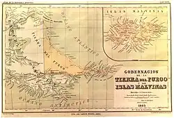Les autres cartes de Paz Soldan montrent les îles contestées comme territoires chiliens : « Gobernación de la Tierra del Fuego y las Islas Malvinas » (voir la carte pleine taille) et « De Tierra del Fuego y Malvinas Mapa » (voir la carte en taille réelle)
