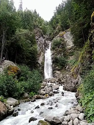 Elle se trouve sur le cours du Dard, un petit torrent descendant du glacier des Pélerins dans le massif du Mont-Blanc et se jetant dans l'Arve[1]. La cascade se trouve a proximité du l'entrée nord du tunnel du Mont-Blanc et est accessible après une courte balade pédestre[1],[2].
