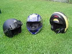 - Casque de moto : en cas de chute, le casque est destiné à protéger contre le choc avec le sol ou les obstacles naturels, mais aussi à protéger de l'abrasion provoquée par le glissement sur la chaussée. Quel que soit le choc (accident, chute…), le casque doit impérativement être changé. D'une manière générale, un casque se change tous les cinq ans. Le casque de moto a aussi une fonction de protection des yeux contre le vent, les insectes..., voire une fonction de confort en comprenant un dispositif de climatisation ou de chauffage et des haut-parleurs pour écouter de la musique ou un compagnon de route. Cependant, encore plus qu'en voiture, l'usage du téléphone portable doit être évité, car le risque d'accident est très important. Le port du casque pour les motards est obligatoire, en France, depuis le .