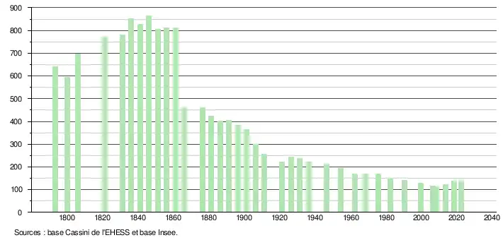 | L'évolution du nombre d'habitants est connue à travers les recensements de la population effectués dans la commune depuis 1793. Pour les communes de moins de 10 000 habitants, une enquête de recensement portant sur toute la population est réalisée tous les cinq ans, les populations de référence des années intermédiaires étant quant à elles estimées par interpolation ou extrapolation[29]. Pour la commune, le premier recensement exhaustif entrant dans le cadre du nouveau dispositif a été réalisé en 2008[30]. En 2022, la commune comptait 137 habitants[Note 4], en évolution de +3,01 % par rapport à 2016 (Hautes-Pyrénées : +1,59 %, France hors Mayotte : +2,11 %). |