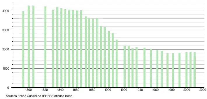 L'évolution du nombre d'habitants est connue à travers les recensements de la population effectués dans la commune depuis 1793. À partir du , les populations légales des communes sont publiées annuellement dans le cadre d'un recensement qui repose désormais sur une collecte d'information annuelle, concernant successivement tous les territoires communaux au cours d'une période de cinq ans. Pour les communes de moins de 10 000 habitants, une enquête de recensement portant sur toute la population est réalisée tous les cinq ans, les populations légales des années intermédiaires étant quant à elles estimées par interpolation ou extrapolation[9]. Pour la commune, le premier recensement exhaustif entrant dans le cadre du nouveau dispositif a été réalisé en 2004[10],[Note 1].