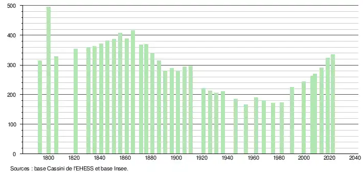 L'évolution du nombre d'habitants est connue à travers les recensements de la population effectués dans la commune depuis 1793. Pour les communes de moins de 10 000 habitants, une enquête de recensement portant sur toute la population est réalisée tous les cinq ans, les populations de référence des années intermédiaires étant quant à elles estimées par interpolation ou extrapolation[41]. Pour la commune, le premier recensement exhaustif entrant dans le cadre du nouveau dispositif a été réalisé en 2008[42].