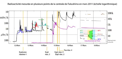 Selon une dépêche diffusée le au soir par l’agence de presse japonaise Kyodo[78], l’autorité de sûreté nucléaire japonaise (NISA) a calculé que les rejets de radioactivité ont été en certains endroits de l’ordre de 10 000 térabecquerels par heure dans les jours qui ont suivi le début de l’accident nucléaire.