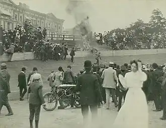Dans le Sport-Album der Radwelt[note 5], l'incident est décrit ainsi : « […] Borchardt, le pilote du tandem Ryser, a dû virer brusquement vers le haut pour éviter une chute. Mais à grande vitesse, il n'a pas pu contrôler sa machine. Elle a continué en position horizontale sur une dizaine de mètres le long de la balustrade, puis a volé en arc de cercle jusqu'au milieu des spectateurs. »[13]. « Au bord du virage, un véhicule à moteur est en feu, des motos et des coureurs se précipitent les uns sur les autres, certains d'entre eux volent comme des boulets de canon sur la zone de sable à l'intérieur. Les motos et les vélos dévalent la piste, les spectateurs pâles et excités sautent de leurs sièges, un moment de consternation impuissante règne parmi les milliers de spectateurs », a rapporté plus tard un témoin oculaire au Berliner Tageblatt . L’incendie se propage rapidement – la piste fraîchement goudronnée fournit suffisamment de combustible. Des spectateurs sont prisonniers sous la moto en feu ; Imbibés d’essence, leurs vêtements prennent feu. Des cris sont entendus ; des gens en feu courent dans tous les sens : « Une panique terrible s’est produite[14]. ».
