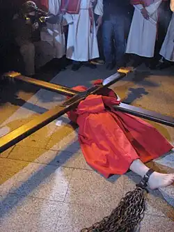 Le pénitent est vêtu de rouge et porte une croix de chêne qui pèse 33 kilos[1] (âge du Christ à sa mort). Le pénitent marche déchaussé, c'est-à-dire pieds nus dans les rues de Sartène. Attachée à son pied droit, la chaîne qu’il traîne pendant la procession pèse 14 kilos[9](14 pour les 14 stations du chemin de croix), elle ralentit sa marche et produit un son sinistre qui marque aussi sa progression dans les rues de la ville. La chaîne est liée à la cheville du pénitent rouge avec une attache en cuir. Avant 1955, la chaîne était attachée au pied par une élingue. Au cours des 1800 mètres qu'il parcourt, le pénitent doit se laisser tomber trois fois[10], tout comme le Christ sur le chemin vers le Golgotha. Pour la première fois, il tombe sur la route de Sant'Anna, près de l'ancienne chapelle. Il tombe une deuxième fois sur la Place de a Porta. Enfin, il tombe une troisième fois près de l'ancienne chapelle Sainte-Lucie.