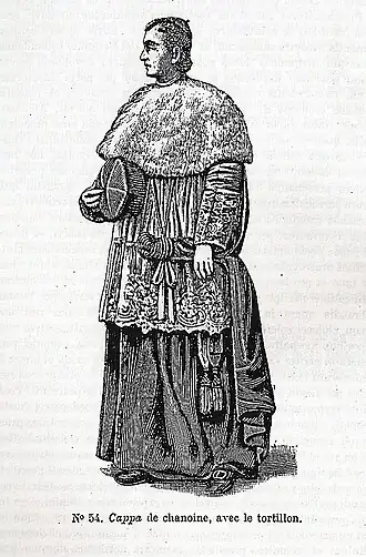 Leur habit de chœur consistait en un surplis à ailes flottantes et une aumusse sur le bras gauche, laquelle était une ample fourrure d'hermine ou de petit gris descendant jusqu'aux pieds. En hiver, ils mettaient par-dessus le surplis un long et large manteau de drap noir dont le devant était doublé d'une étoffe de soie cramoisi ; il était recouvert d'un camail noir à pointe descendant jusqu'aux talons, et dont le capuce était doublé de fourrure. Souvent même, ils s'enveloppaient la tête dans leur aumusse, durant les grands froids, pendant les matines qu'ils chantaient régulièrement et quotidiennement à six heures[18].