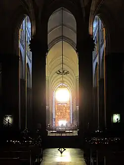 Ce n'est que sous l'épiscopat d'Hector Quilliet, au lendemain de la guerre, que les travaux de la cathédrale reprennent pour engager la construction du transept[39]. Le troisième évêque de Lille, Achille Liénart, dont le long épiscopat s'étend de 1928 à 1968, porte une évolution plus qu'une révolution, celle engagée près de quarante ans plus tôt par Léon XIII et l'encyclique Rerum novarum de 1891, poursuivie par Pie XI. Issu d'une famille de la bourgeoisie lilloise, Achille Liénart soutient financièrement et moralement les grévistes d'Halluin en 1928–1929, puis, dès 1930–1932, l'Action catholique spécialisée[40].