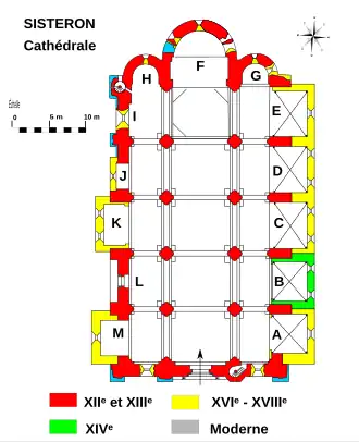 En 1564 la cathédrale est saccagée par les protestants au cours des guerres de Religion ; le clocher est abattu, les cloches brisées, les autels renversés, les archives et le mobilier brûlés. Après cette période de destruction, la cathédrale est agrandie par l'adjonction de chapelles latérales greffées à ses collatéraux : cinq chapelles alignées sur le même tracé sont ajoutées du côté sud à l'emplacement de l'ancien cloître démoli tandis que du côté nord trois chapelles de profondeurs inégales sont construites contre le mur gouttereau. La restauration complète de la cathédrale ne sera entreprise que sous l'épiscopat de Toussaint de Glandevès (1606-1648)[3]. La voûte de la nef est en grande partie reprise, la toiture refaite et le beffroi du clocher reconstruit [MV 3].