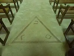 - un triangle équilatéral marqué des trois lettres hébraïques כ, ר, מ formant le mot כֶּרֶם désignant la vigne en hébreu