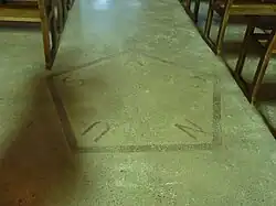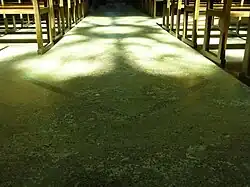 Depuis l'entrée de la nef, le cheminement est marqué de plusieurs étapes, symboles gravés au sol et rehaussés de métal incrusté.