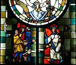 - ↑ Le texte en majuscule reprend les lettres et les points inscrits dans le vitrail.