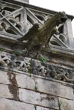 Le clocher à base carrée, décentré vers le nord, signe l'origine romane de l'édifice. Il est du XIe siècle, contemporain de la construction de la nef initiale. L'épaisse chemise qui entoure et consolide sa base depuis le XIVe siècle obture les ouvertures des niveaux romans, elle permet de supporter les quatre étages gothiques, carré pour le premier puis octogonaux pour les trois supérieurs, avec quatre contreforts sous la forme de tourelles octogonales aux quatre angles du carré. Une toiture basse couvre le dernier étage, en remplacement de la flèche en pierre détruite par la foudre en 1483[29]. Le narthex qui relie le clocher porche à la nef apparaît bas entre le clocher de 62 mètres et la façade de la nef. Cette façade est encadrée de deux tourelles octogonales encadrant la grande rosace, le pignon triangulaire, orné d'une petite rose sculptée, laisse courir à sa base une galerie ajourée en pierre, c'est la galerie supérieure qui fait le tour de l'édifice à la base du toit. De chaque côté de la nef un système double d'arc-boutant s'appuyant sur des culées[note 5] minces mais larges, surmontées de pinacles et portant les gargouilles, encadrent les chapelles latérales[note 6]. Une deuxième galerie borde les terrasses des chapelles, elle contourne par l'extérieur les culées des contreforts tout autour de l'édifice. La base des culées, plus épaisse, sépare chaque chapelle rayonnante[32].