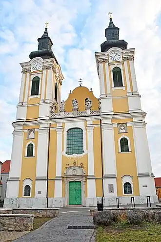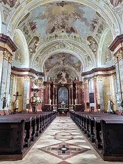Le chœur et l'autel ont été conçus par le célèbre architecte autrichien Franz Anton Hillebrand. Les fresques intérieures représentent des scènes de la vie du roi Étienne Ier. Le retable représentant le roi Étienne agenouillé devant la Grande Dame des Hongrois ( Magna Domina) – vocable de Notre-Dame que le bénédictin saint Gérard de Csanád proposa au Hongrois[1] – est l'œuvre de Vinzenz Fischer, tandis que les peintures de Johan Cymbala se distinguent au plafond.
