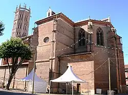 Le clocher de style gothique toulousain s'inspire fortement de celui des Jacobins de Toulouse : imposante et briquetée, la tour octogonale est éclairée à chaque étage de fenêtres géminées terminées par un arc en mitre. Elle remonte au XIVe siècle. On pourra remarquer les créneaux et les meurtrières, témoignant du passé houleux de la ville.
