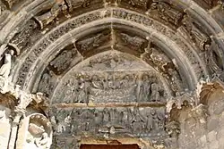 Le tympan du portail, au-dessus du linteau consacré à l'histoire de saint Jean-Baptiste, de sa nativité à son martyre, représente le thème du Jugement dernier. Il est divisé en trois registres :