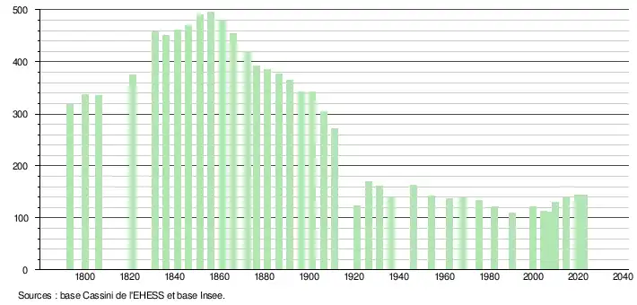 L'évolution du nombre d'habitants est connue à travers les recensements de la population effectués dans la commune depuis 1793. Pour les communes de moins de 10 000 habitants, une enquête de recensement portant sur toute la population est réalisée tous les cinq ans, les populations de référence des années intermédiaires étant quant à elles estimées par interpolation ou extrapolation[24]. Pour la commune, le premier recensement exhaustif entrant dans le cadre du nouveau dispositif a été réalisé en 2004[25].