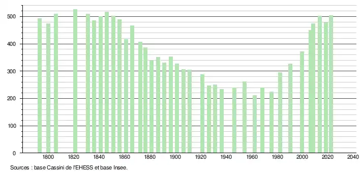 L'évolution du nombre d'habitants est connue à travers les recensements de la population effectués dans la commune depuis 1793. Pour les communes de moins de 10 000 habitants, une enquête de recensement portant sur toute la population est réalisée tous les cinq ans, les populations de référence des années intermédiaires étant quant à elles estimées par interpolation ou extrapolation[25]. Pour la commune, le premier recensement exhaustif entrant dans le cadre du nouveau dispositif a été réalisé en 2008[26].