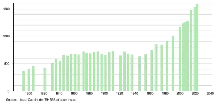 L'évolution du nombre d'habitants est connue à travers les recensements de la population effectués dans la commune depuis 1793. Pour les communes de moins de 10 000 habitants, une enquête de recensement portant sur toute la population est réalisée tous les cinq ans, les populations de référence des années intermédiaires étant quant à elles estimées par interpolation ou extrapolation[29]. Pour la commune, le premier recensement exhaustif entrant dans le cadre du nouveau dispositif a été réalisé en 2004[30].