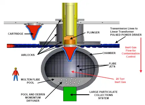 - la paroi interne de la chambre du réacteur est parcourue par un courant de flibe (mélange liquide de fluorure de lithium et de difluorure de béryllium) destiné à la protéger, à récupérer l'énergie de fusion et à produire du tritium[11] ;