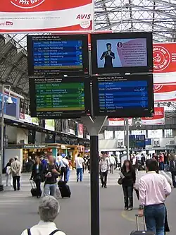 - les points d'information départs : ces tableaux monumentaux sont composés d'un affichage des prochains départs, d'une horloge et d'un tableau d'information conjoncturelle. Les modèles les plus récents mixent des matrices de LED et des dalles TFT pour présenter les informations, mais des modèles utilisant des palettes ont aussi existé. Ils sont aujourd'hui abandonnés au profit de points d'affichages mieux répartis dans la gare ;