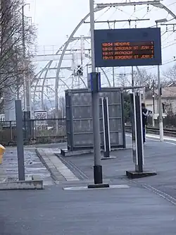 - sur le quai, un tableau de quai (TQ), perpendiculaire à la voie, indique la desserte du train. Il y a en général plusieurs TQ sur un quai. Pour le voyageur, plus de doute, il est sur le bon quai, à la bonne voie ;