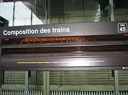 - les tableaux de repérages des voitures à LED : situés sur le quai, parallèlement à la voie, ces tableaux permettent aux voyageurs de se repérer et de se positionner sur le quai avant même l'arrivée du train. Un ensemble de LED permettent de dessiner le train dans le respect de sa composition (type et numéros des voitures)